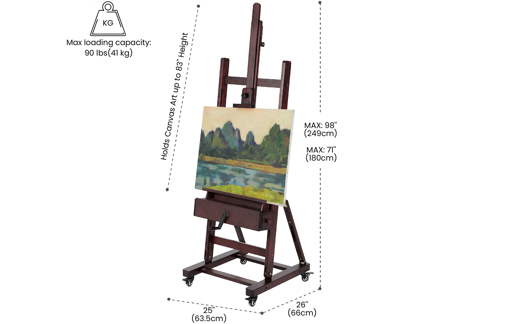 - Convenient Storage and Mobility: Specially designed with a front art supply compartment and two side storage drawers for easy access to supplies. For mobility, the floor easel is equipped with four 360-degree fully swivel castors and two up-front locking brakes on the castors to provide stability while painting. The deluxe and utility design, combined with master hand craftsmanship, makes this Crank Adjusting H-Frame Easel the most advanced crank-assist easel in the world.swivel castors, and two up-front locking breaks on the castors to provide stability while painting. The Deluxe and utility design, and master hand craftsmanship meet in this Crank Adjusting H Frame Easel, making it the most advanced crank-assist easel in the world!