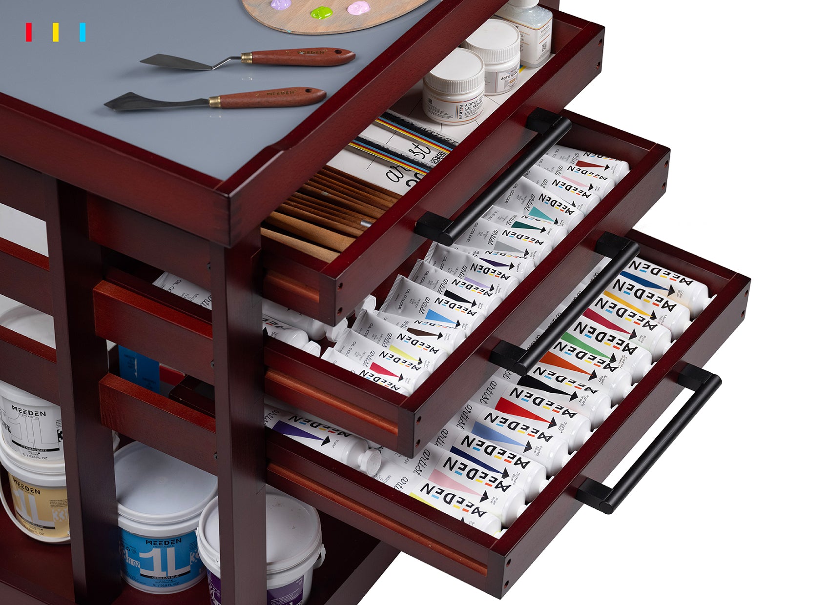 The three-tiered drawers are designed for effortless access, with smooth glides that make reaching your art supplies a breeze. Their spacious compartments provide ample room to store and organize your materials, ensuring a clutter-free workspace and enhancing your creative efficiency.