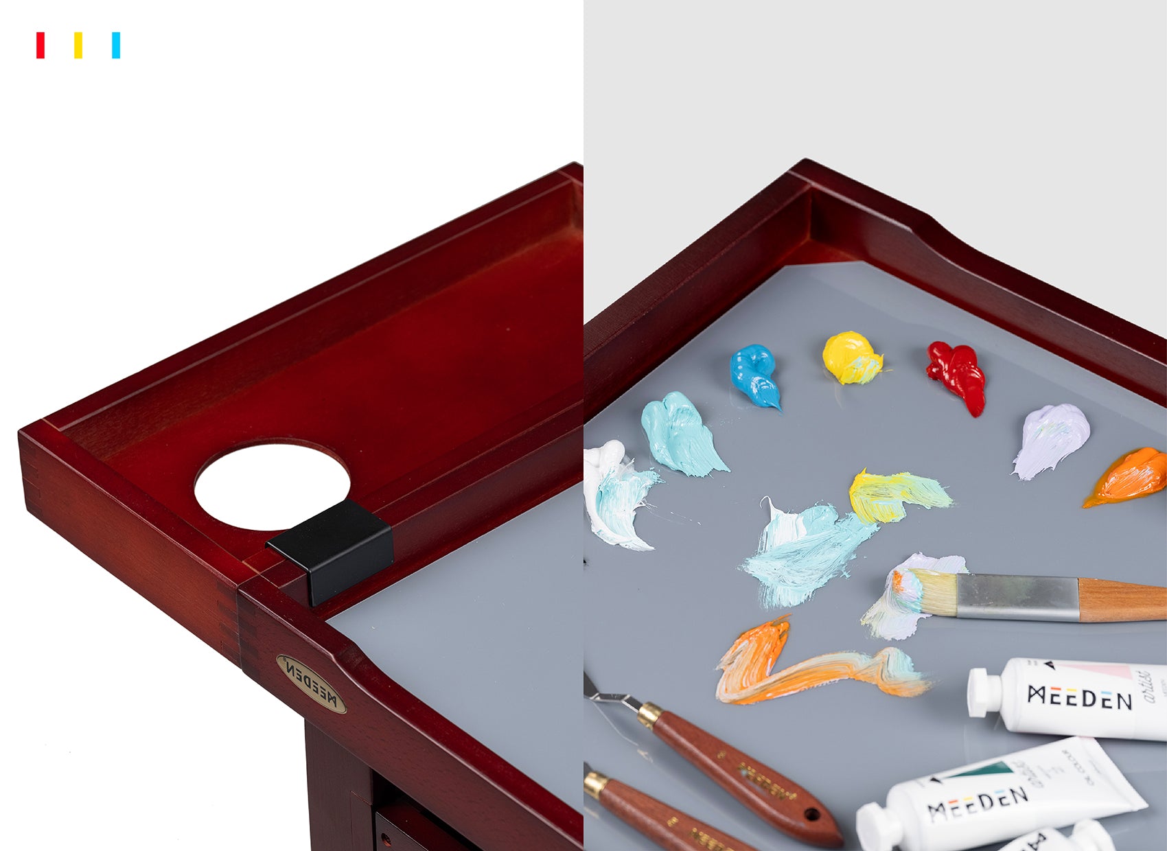 - More Storage Possibilities: The 2-tier wood shelf and 3-layer drawers offer ample storage space for art supplies while saving floor space, keeping everything organized and neat. Additionally, there is an extra hanging detachable tray, convenient for easy access and use on its own.