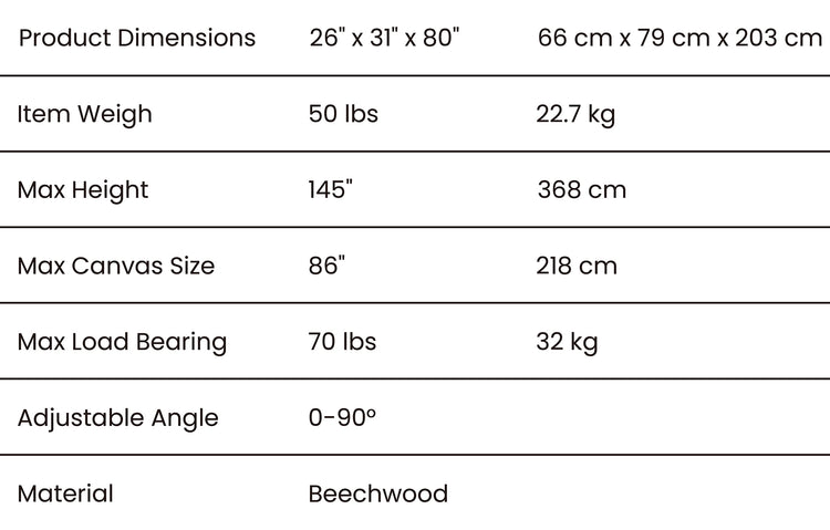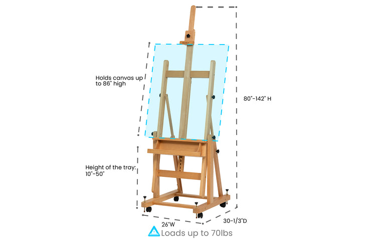 - GERMAN BEECHWOOD - This MEEDEN H-frame easel is constructed of premium German beech wood, known for its large size, strength, and attractive grain patterns that add the aesthetic and ensure durability. Combined with the corrosion-resistant metal hardware, the art easel holds artwork up to 86", and loads up to 70 lbs.